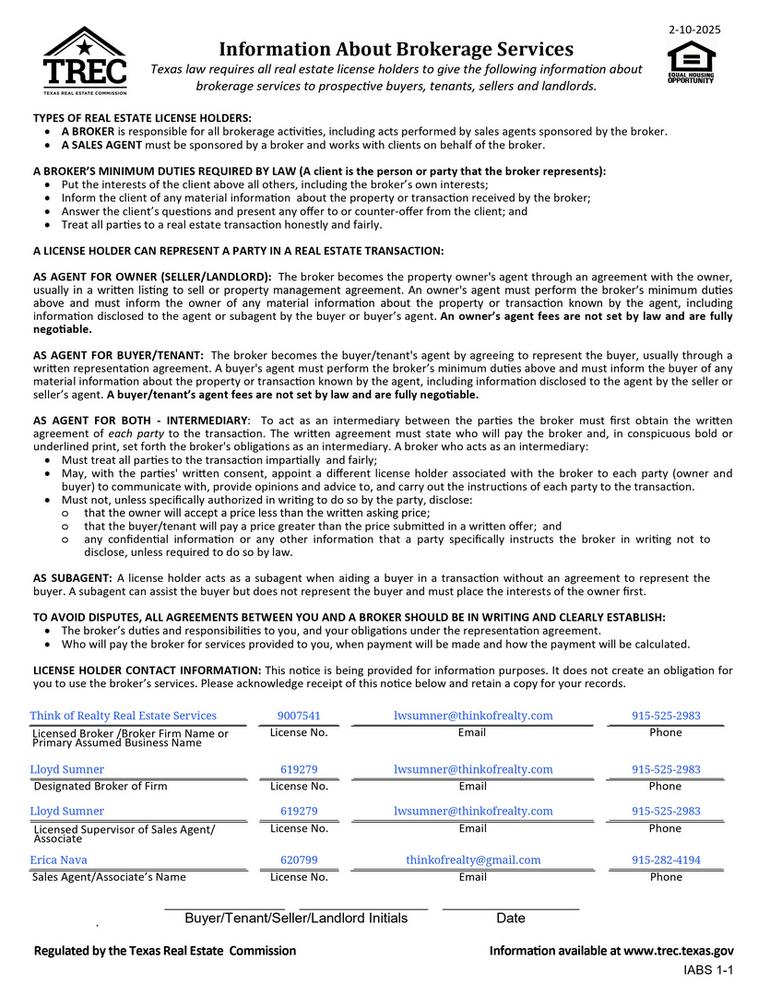 Texas law requires all real estate license holders to give the following Information About Brokerage Services & the Texas Consumer Protection Notice information to prospective clients.